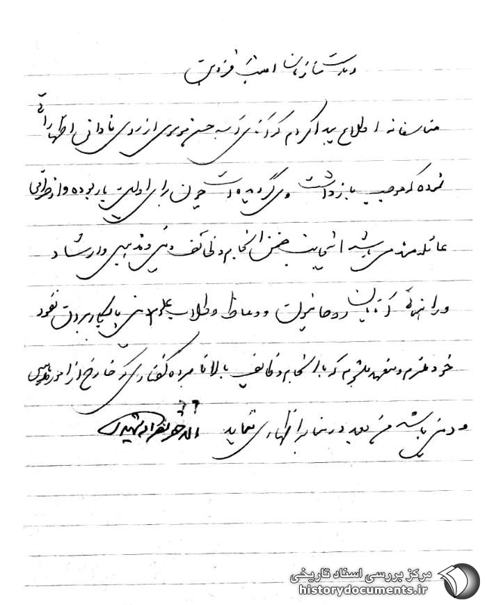 متاسفانه اطلاع پیدا کردم که آقای سیدحسن موسوی از روی نادانی اظهاراتی نموده که موجب بازداشت وی گردیده است چون برای اولین بار بوده و از طرفی عائلهمند میباشد اینجانب ضمن انجام وظایف دینی و مذهبی و ارشاد و راهنمایی آقایان روحانیون و وعاظ و طلاب علوم دینی با به کار بردن نفوذ خود ملزم و متعهد میشوم که با انجام وظائف بالا نامبرده گفتاری که خارج از امور مذهبی و دینی باشد من بعد در منابر اظهاری ننماید.