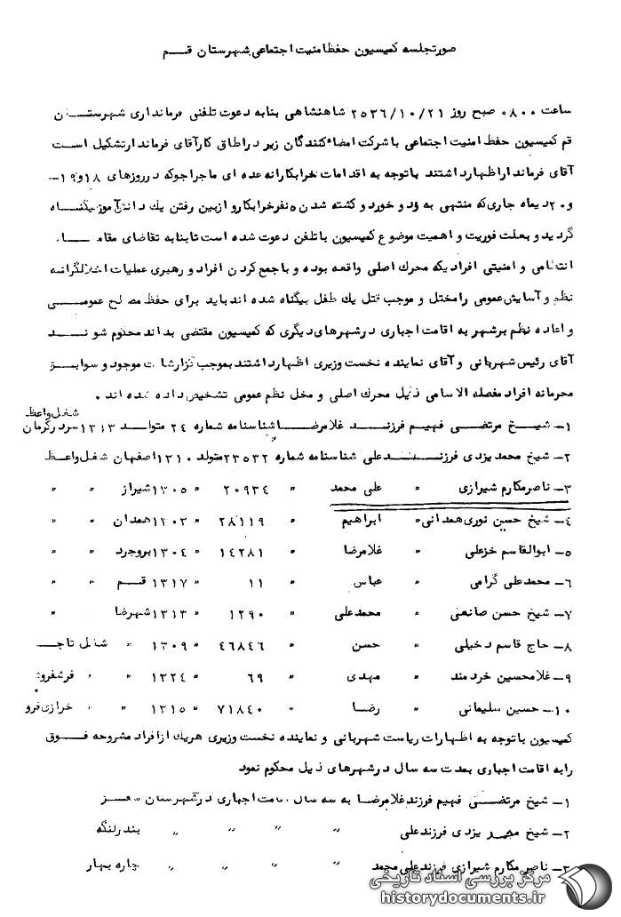 ساعت 0800 صبح روز 21 /10 /2536 شاهنشاهی بنا به دعوت تلفنی فرمانداری شهرستان قم کمیسیون حفظ امنیت اجتماعی با شرکت امضاءکنندگان زیر در اتاق کار آقای فرماندار تشکیل است. آقای فرماندار اظهار داشتند با توجه به اقدامات خرابکارانه عدهای ماجراجو که در روزهای 18 و 19 و 20 دی ماه جاری که منتهی به زد و خورد و کشته شدن 5 نفر خرابکار و از بین رفتن یک دانشآموز بیگناه گردید و به علت فوریت و اهمیت موضوع کمیسیون با تلفن دعوت شده است تا بنا به تقاضای مقامات انتظامی و امنیتی افرادی که محرک اصلی واقعه بوده و با جمع کردن افراد و رهبری عملیات اخلالگرانه نظم و آسایش عمومی را مختل و موجب قتل یک طفل بیگناه شدهاند باید برای حفظ مصالح عمومی و اعاده نظم بر شهر به اقامت اجباری در شهرهای دیگری که کمیسیون مقتضی بداند محکوم شوند. آقای رئیس شهربانی و آقای نماینده نخستوزیری اظهار داشتند به موجب گزارشات موجود و سوابق محرمانه افراد مفصله الاسامی ذیل محرک اصلی و مخل نظم عمومی تشخیص داده شدهاند.