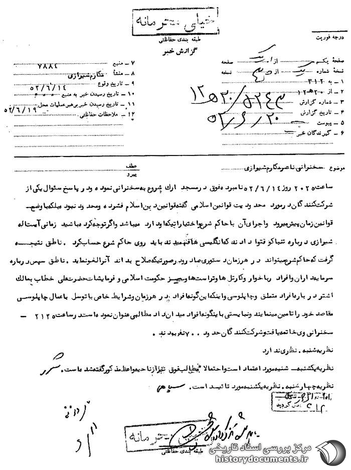 ساعت 2025 روز 14 /6 /52 نامبرده فوق در مسجد ارک شروع به سخنرانی نموده و در پاسخ سؤال یکی از شرکتکنندگان در مورد محدودیت قوانین اسلامی گفته قوانین دین اسلام فشرده و محدود نبوده بلکه با وضع قوانین زمان پیش میرود و اجرای آن با حاکم شرع و اختیاراتی که او دارد میباشد و اگر توجه کرده باشید زمانی آیتاله شیرازی درباره تنباکو فتوا دادند که انگلیسیها فهمیدند باید روی حاکم شرع حساب کرد. ناطق نتیجه گرفت که حاکم شرع میتواند در هر زمان دستوری صادر و در صورتی که صلاح بداند آن را لغو نماید. ناطق سپس درباره سرمایهداران و افراد رباخوار و کارتلها و تراستها و نیز حکومت اسلامی و فرمایشات حضرت علی خطاب به مالکاشتر درباره افراد متملق و چاپلوس و اینکه اینگونه افراد در هر زمان و شرایط خاص با توسل به اعمال چاپلوسی مقاصد خود را تأمین مینمایند و نبایستی به اینگونه افراد میدان داد، مطالبی عنوان نموده است. در ساعت 2125 سخنرانی وی خاتمه یافت و شرکتکنندگان حدود 700 نفر بودند.