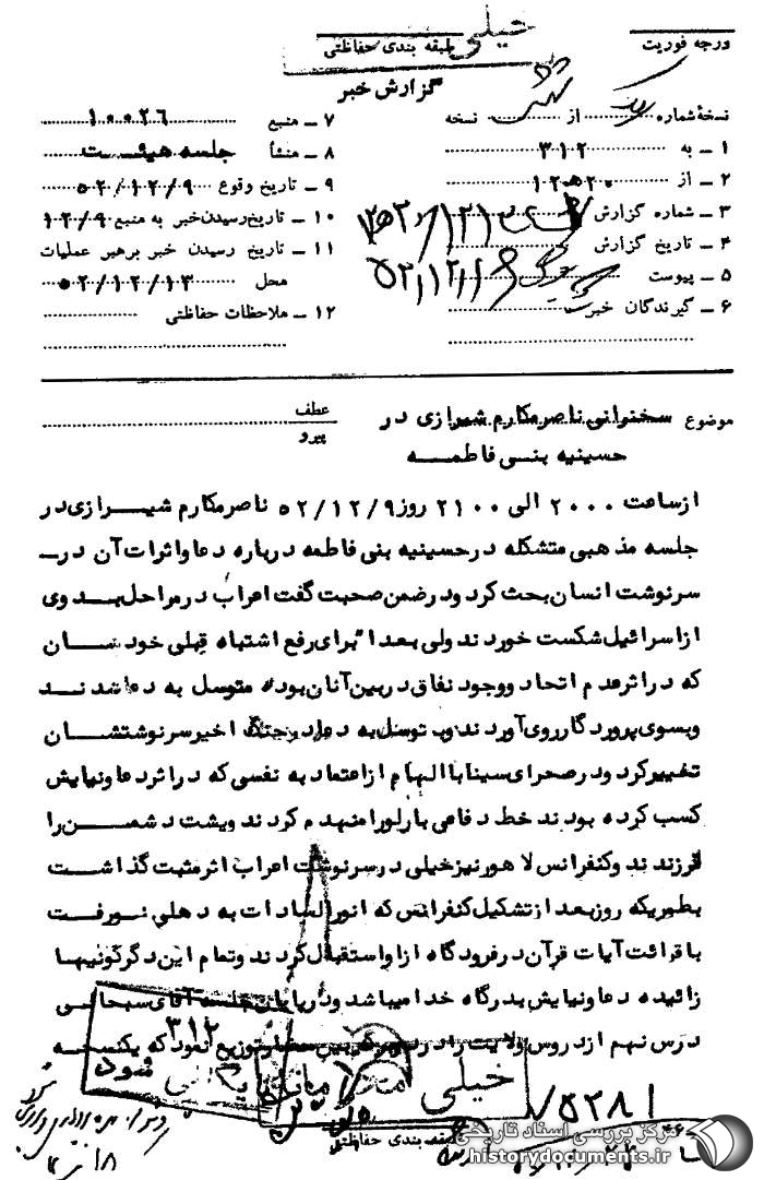 از ساعت 2000 الی 2100 روز 9 /12 /52 ناصر مکارم شیرازی در جلسه مذهبی متشکله در حسینیه بنیفاطمه درباره دعا و اثرات آن در سرنوشت انسان بحث کرد و در ضمن صحبت گفت اعراب در مراحل بدوی از اسرائیل شکست خوردند ولی بعداً برای رفع اشتباه قبلی خودشان که در اثر عدم اتحاد و وجود نفاق در بین آنان بود متوسل به دعا شدند و به سوی پروردگار روی آوردند و با توسل به دعا در جنگ اخیر سرنوشتشان تغییر کرد و در صحرای سینا با الهام از اعتماد به نفسی که در اثر دعا و نیایش کسب کرده بودند خط دفاعی بارلو1 را منهدم کردند و پشت دشمن را لرزاندند و کارشناس لاهور نیز در سرنوشت اعراب اثر مثبت گذاشت به طوری که روز بعد از تشکیل کنفرانس که انورالسادات2 به دهلی نو رفت با قرائت آیات قرآن در فرودگاه از او استقبال کردند و تمام این دگرگونیها زائیده دعا و نیایش به درگاه خدا میباشد و در پایان جلسه آقای سبحانی درس نهم از دروس ولایت را در دو برگ بین حضار توزیع نمود که یک نسخه آن به پیوست3 تقدیم میگردد.