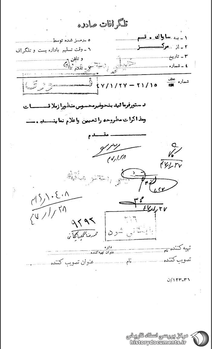 تلگرافات صادره شماره عطف 15/21 ـ 27/1/47