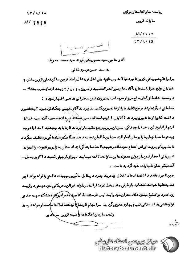 برابر اعلام شهربانی قزوین نامبرده بالا مدرس علوم دینی اهل قریه شال رامند قزوین ساکن فعلی قزوین بخش 2 خیابان مولوی منزل استیجاری آقای میرزا نصراله شهیدی در روز 15 / 8 / 43 بعد از نماز مغرب و عشاء در مسجد شاهطاق آقای حاج میرزا رحیم سامت به منبر رفته ضمن سخنرانی مذهبی اظهار نموده:
