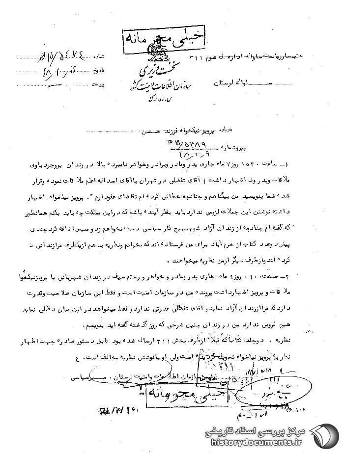 شهربانی با پرویز نیکخواه ملاقات و پرویز اظهار داشت پرونده من در سازمان