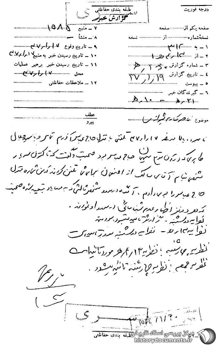 نامبرده بالا مورخه 17 /1 /37 تلفنی با منزل حاج عباس آزرم تماس و با سیدجلال طاهری1 که در آن موقع میهمان حاج عباس بود صحبت و گفت که تاکنون سه بار شخصی به نام آقای سالک از اصفهان برای شما تلفن کردند که من شماره منزل حاج عباس را به وی دادم. آنگاه در مورد شخص ثالثی که به مهاباد تبعید شده صحبت که هر دو نفر اظهار عدم شناسایی در مورد او نمودند.