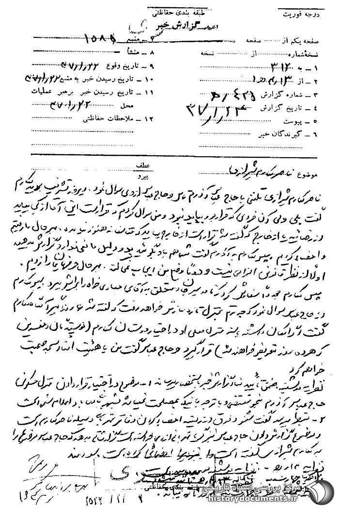نظریه دوشنبه. ضمن تأیید مفاد گزارش خبر به استحضار میرساند 1. موضوع در اختیار قرار دادن منزل مسکونی حاج عباس آزرم به نحو مقتضی و با توجه به اینکه به مصلحت نمیباشد به شهربانی مهاباد اعلام شده است. 2. به نظر میرسد گفت[و]شنود فوق در زمینه امضا کردن دفاتر شهربانی وسیله ناصر مکارم است و موضوع گزارش دادن حاج عباس نیز گویا شهربانی از وی خواسته است گزارشاتی بدهد که حاج عباس موضوع را به مکارم شیرازی گفته است و او نیز وی را راهنمایی کرده است.