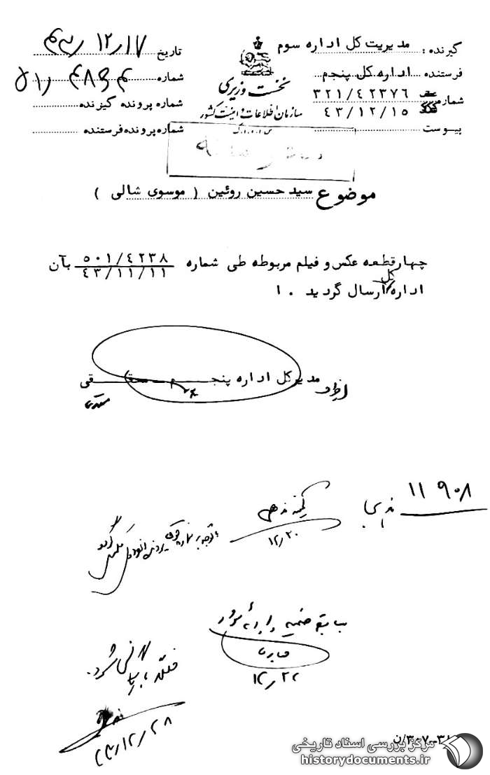 چهار قطعه عکس و فیلم مربوطه طی شماره 4238 / 501 ـ 11 / 11 / 43 به آن اداره کل ارسال گردید.