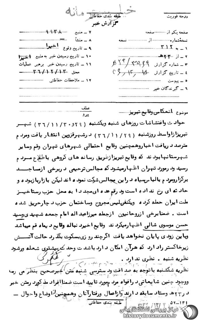 حوادث و اغتشاشات روزهای شنبه و یکشنبه (29 و 30 / 11 / 36) شهر تبریز1 از اواسط روز شنبه (29 / ۱۱ / ۳۶) در شهر قزوین انتشار یافت و مردم مترصد دریافت اخبار و همچنین وقایع احتمالی شهرهای تهران و قم و سایر شهرستانها بودند که وقایع تبریز از طریق رسانههای گروهی به اطلاع مردم رسید و در مورد تهران اظهار میشود که مجالس ترحیمی در برخی از مساجد برگزار و مردم با لباس سیاه در این مجالس شرکت نمودهاند لیکن بازار باز بوده و حادثهای رخ نداده است و در قم عدهای مجدداً به محل حزب رستاخیز ملت ایران2 حمله کرده و یک نفر پلیس مجروح و ساختمان حزب دچار حریق شده است ضمناً برخی از روحانیون از جمله میرزا عبدالله امام جمعه شهیدی و سیدحسن موسوی شالی اظهار میکردند وقایع اخیر دنباله وقایع دی ماه قم میباشد و به این زودی پایان نخواهد یافت اگر چند روزی به سکوت بگذرد حالت آتش زیر خاکستر را دارد که هر آن امکان دارد با شدت و حدت بیشتری شعلهور شود.