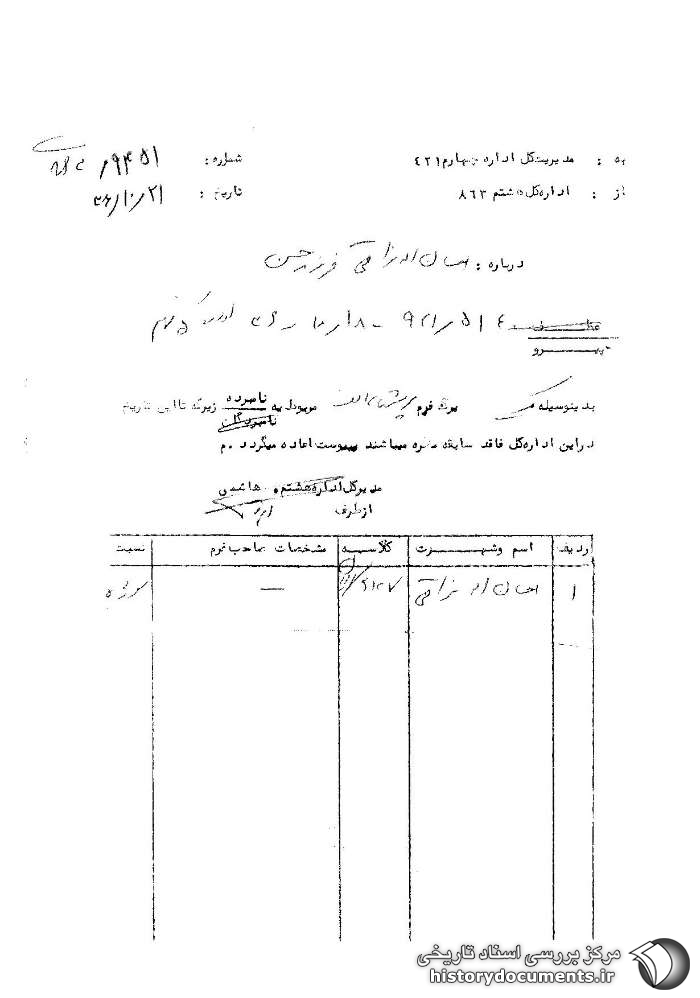 بدینوسیله یک برگ فرم پرسشنامه الف مربوط به نامبرده زیر که تا این تاریخ در این اداره کل فاقد سابقه مضره میباشند به پیوست اعاده میگردد.