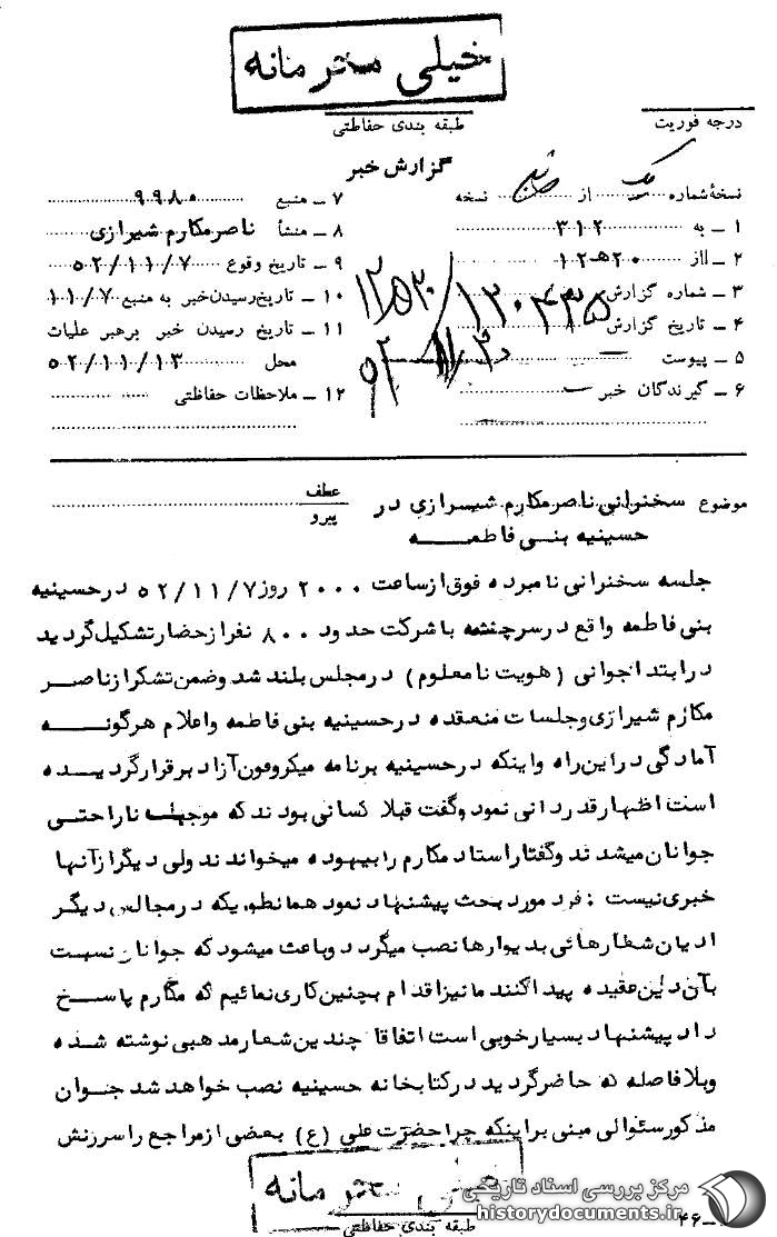 جلسه سخنرانی نامبرده فوق از ساعت 2000 روز 7 /11 /52 در حسینیه بنیفاطمه واقع در سرچشمه با شرکت حدود 800 نفر از حضار تشکیل گردید. در ابتدا جوانی (هویت نامعلوم) در مجلس بلند شد و ضمن تشکر از ناصر مکارم شیرازی و جلسات منعقده در حسینیه بنیفاطمه و اعلام هرگونه آمادگی در این راه و اینکه در حسینیه برنامه میکروفون آزاد برقرار گردیده است اظهار قدردانی نمود و گفت قبلاً کسانی بودند که موجب ناراحتی جوانان میشدند و گفتار استاد مکارم را بیهوده میخواندند ولی دیگر از آنها خبری نیست. فرد مورد بحث پیشنهاد نمود همانطوری که در مجالس دیگر ادیان شعارهایی به دیوارها نصب میگردد و باعث میشود که جوانان نسبت به آن دین عقیده پیدا کنند ما نیز اقدام به چنین کاری نماییم که مکارم پاسخ داد پیشنهاد بسیار خوبی است. اتفاقاً چندین شعار مذهبی نوشته شده و بلافاصله که حاضر گردید در کتابخانه حسینیه نصب خواهد شد. جوان مذکور سؤالی مبنی بر اینکه چرا حضرت علی (ع) بعضی از مراجع را سرزنش کردهاند چنین پاسخ گفت چون آنها میگفتند بعضی مسائل را قرآن و حدیث بیان نکرده و به همین جهت باید مجتهدین فتوا دهند. ناطق سپس پیرامون اسلام و بحرانهای سیاسی جهان چنین عنوان نمود از آنجاییکه سیاستهای دنیا غلط است و روز به روز وضع دنیا به بدبختی میرود کما اینکه در روزنامهای خواندم که دستگاه جاسوسی آمریکا 300 هزار نفر عضو دارد و چه پولهای کلانی در این راهها خرج میشود لذا نتیجهگیری نمود که سیاستهای امروزه بر اساس سودجویی بنیانگذاری شده است مثلاً از یک سیاستمدار انگلیسی سؤال میشود چرا برای نابودی سیاهپوستان اسلحه صادر میکنید، جواب میدهد ما از این راه زندگی میکنیم. پس ملاحظه میکنید که چه سیاستهای غلطی در جهان حکمفرماست.