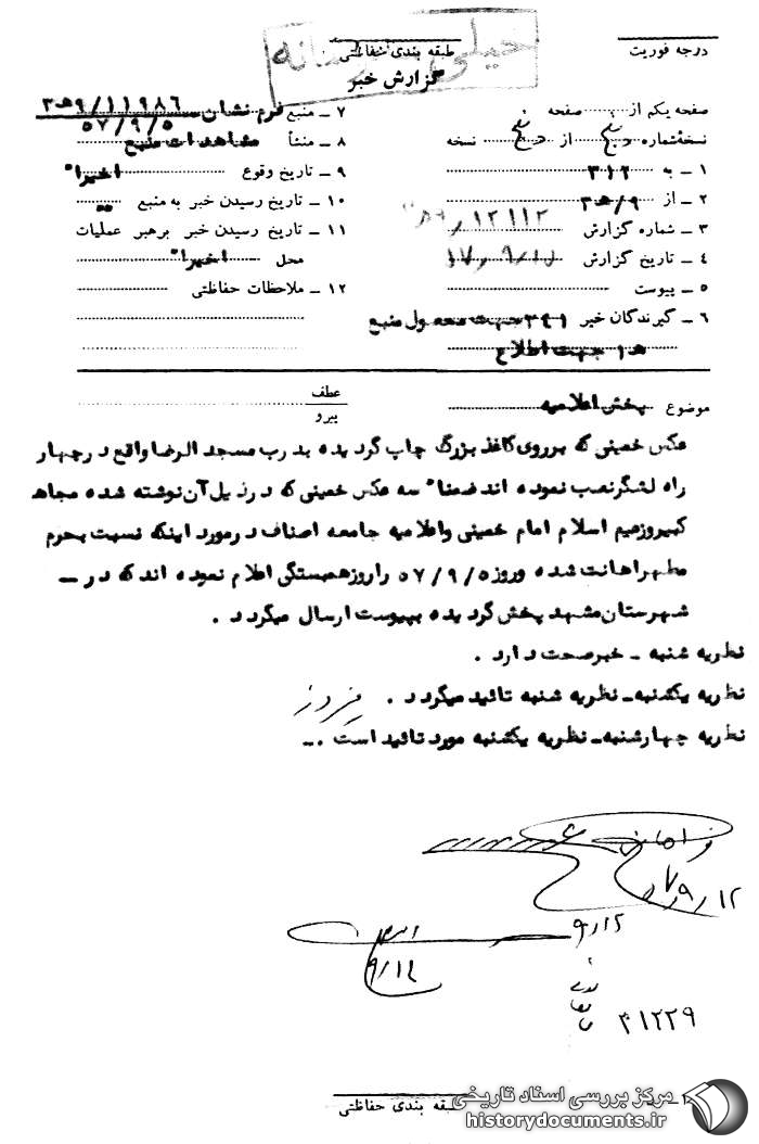 عکس خمینی که بر روی کاغذ بزرگ چاپ گردیده به درب مسجدالرضا واقع در چهارراه لشگر نصب نمودهاند. ضمناً سه عکس خمینی که در زیر آن نوشته شده مجاهد کبیر و زعیم اسلام امام خمینی و اعلامیه جامعه اصناف در مورد اینکه نسبت به حرم مطهر اهانت شده و روز 5 /9 /57 را روز همبستگی اعلام نمودهاند که در شهرستان مشهد پخش گردیده است به پیوست1 ارسال میگردد.