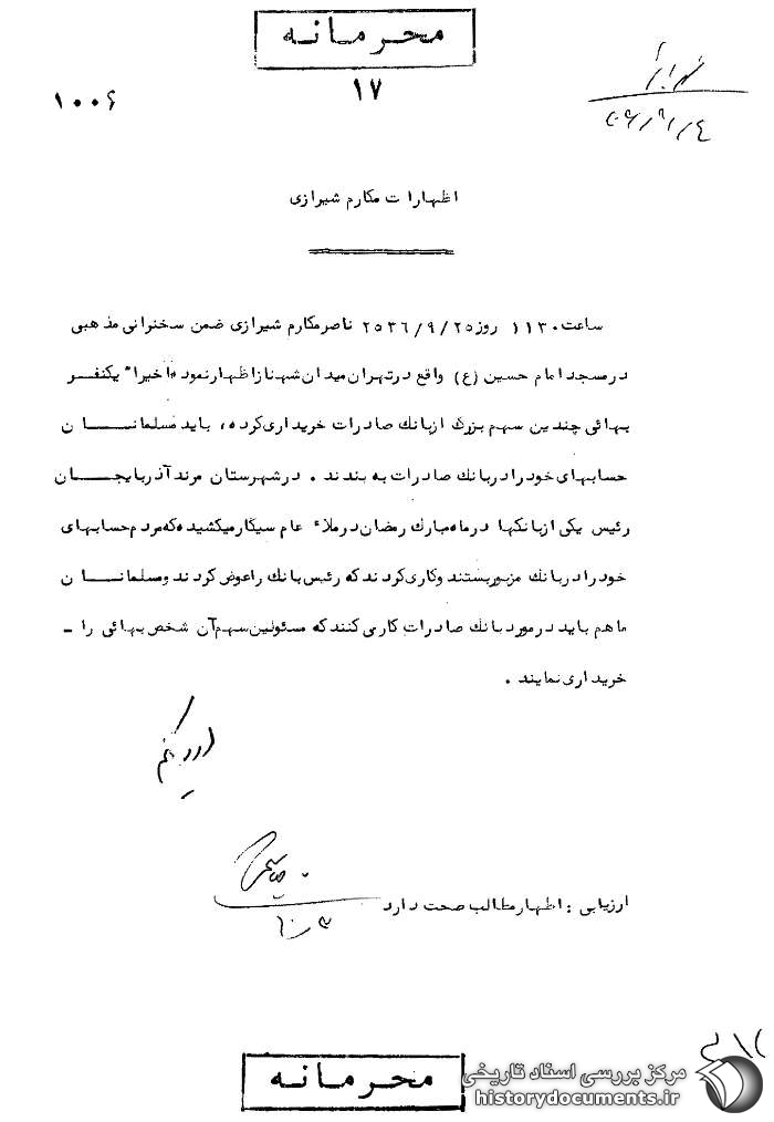 ساعت 1130 روز 25 /9 /2536 ناصر مکارم شیرازی ضمن سخنرانی مذهبی در مسجد امام حسین (ع) واقع در تهران میدان شهناز اظهار نموده اخیراً یک نفر بهایی1 چندین سهم بزرگ از بانک صادرات خریداری کرده، باید مسلمانان حسابهای خود را در بانک صادرات ببندند. در شهرستان مرند آذربایجان رئیس یکی از بانکها در ماه مبارک رمضان در ملأ عام سیگار میکشیده که مردم حسابهای خود را در بانک مزبور بستند و کاری کردند که رئیس بانک را عوض کردند و مسلمانان ما هم باید در مورد بانک صادرات کاری کنند که مسئولین سهم آن شخص بهایی را خریداری نمایند.2