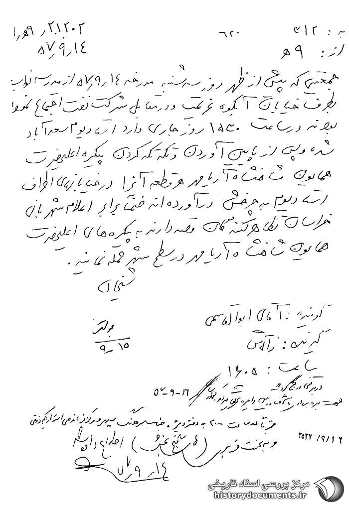 محترماً در ساعت 2000 به دفتر ویژه جناب سرهنگ سپهر و مرکز فرماندهی استوار یکم ذوقی و به نخستوزیری (آقای گنجبخش) اطلاع داده شد. 14 /9 /57