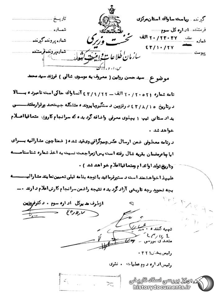 نامه شماره 20521 / 20الف ـ 22 / 9 / 43 آن ساواک حاکی است نامبرده بالا در تاریخ 15 / 8 / 43 در قزوین دستگیر و با پرونده متشکله جهت صدور قرار مقتضی به دادستانی تیپ 1 پهلوی معرفی و اضافه گردیده که سرانجام کار وی متعاقباً اعلام خواهد شد.