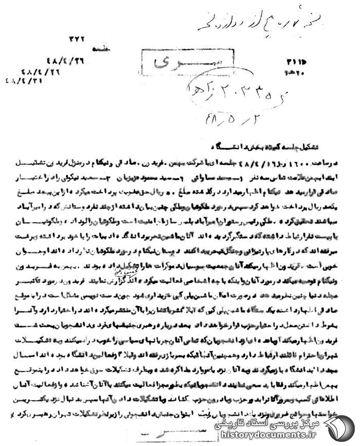 صادقی و نیکنام درمنزل فریدون تشکیل ابتدا بهمن علامت تماس سه نفر 1ـ محمد مساواتی 2ـ سید محمود عزیزیان 3ـ سعید نیکوئی را در اختیار صادقی قرار میدهد نیکنام اظهار میدارد درگذشته مبلغ 50 ریال حق عضویت پرداخت میکرده از این به بعد مبلغ یکصد ریال پرداخت خواهد کرد سپس در مورد ملکوتیان و ملکی چنین بیان داشته از چند نفر دوستانش که در امیرآباد میباشند تحقیق کرده.