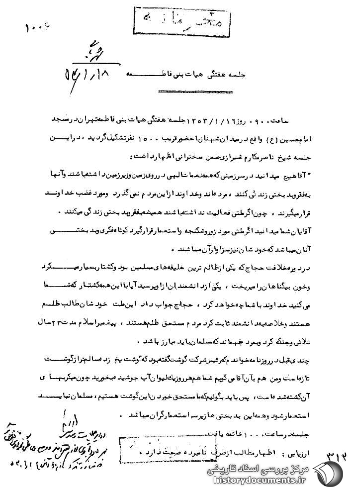ساعت 0900 روز 16 /1 /1353 جلسه هفتگی هیئت بنیفاطمه تهران در مسجد امام حسین(ع) واقع در میدان شهناز با حضور قریب 1500 نفر تشکیل گردید. در این جلسه شیخ ناصر مکارم شیرازی ضمن سخنانی اظهار داشت: