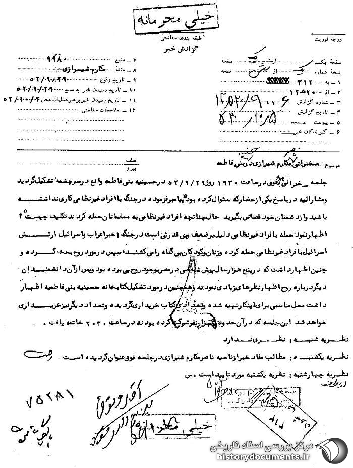 جلسه سخنرانی نامبرده فوق در ساعت 1930 روز 29 /9 /52 در حسینیه بنیفاطمه واقع در سرچشمه تشکیل گردید و مشارالیه در پاسخ یکی از حضار که سؤال کرده بود پیامبر فرموده در جنگ، با افراد غیرنظامی کاری نداشته باشید و از دشمنان خود قصاص بگیرید، حال چنانچه افراد غیرنظامی به مسلمانان حمله کردند تکلیف چیست؟، اظهار نمود، حمله به افراد غیرنظامی دلیل بر ضعف و بیقدرتی است. در جنگ اخیر اعراب و اسرائیل، ارتش اسرائیل به افراد غیرنظامی حمله کرده و زنان و کودکان بیگناه را میکشند. سپس در مورد روح بحث کرده و چنین اظهار داشت که در پنج هزار سال پیش شخصی در مصر به وجود روح پی برده بود و پس از آن دانشمندان دیگر درباره روح اظهارنظرهای زیادی نمودند و همچنین در مورد تشکیل کتابخانه حسینیه بنیفاطمه اظهار داشت محل مناسبی برای این کار تهیه شده و تعدادی کتاب خریداری گردیده و تعدادی دیگر نیز خریداری خواهد شد. این جلسه که در آن حدود یکهزار نفر شرکت کرده بودند تا ساعت 2030 خاتمه یافت.1