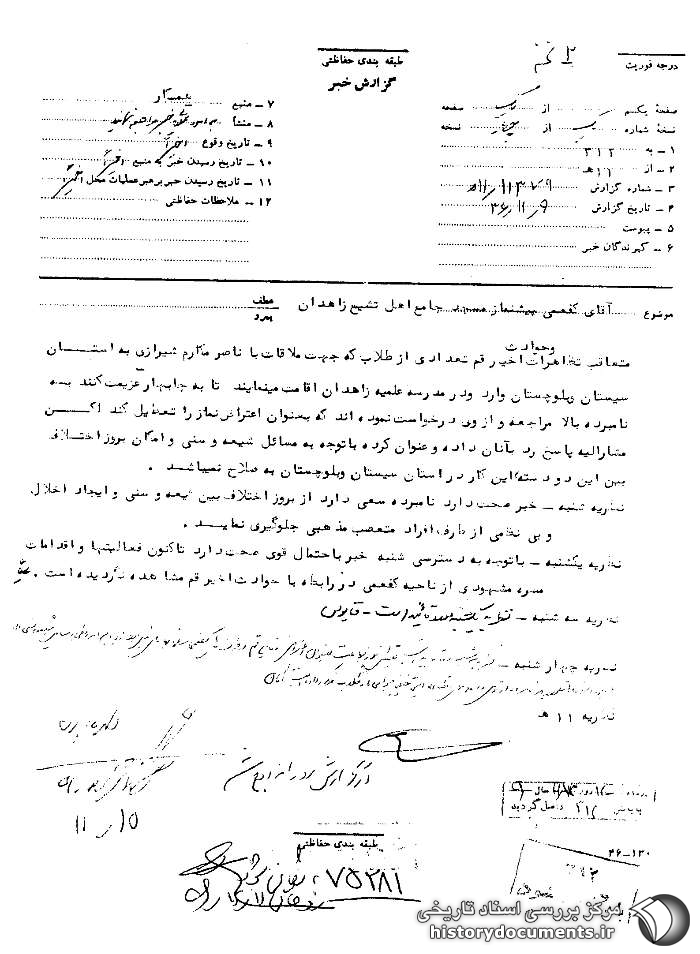 متعاقب تظاهرات و حوادث اخیر قم تعدادی از طلاب که جهت ملاقات با ناصر مکارم شیرازی به استان سیستان و بلوچستان وارد و در مدرسه علمیه زاهدان اقامت مینمایند تا به چابهار عزیمت کنند به نامبرده بالا مراجعه و از وی درخواست نمودهاند که به عنوان اعتراض نماز را تعطیل کند لکن مشارالیه پاسخ رد به آنان داده و عنوان کرده با توجه به مسائل شیعه و سنی و امکان بروز اختلاف بین این دو دسته، این کار در استان سیستان و بلوچستان به صلاح نمیباشد.