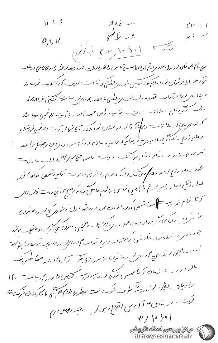شخصی به نام علیخانی1 از منزل موسوی در قم با واعظ طبسی تماس و اظهار داشت امروز بعد از ظهر بی بی سی دو مطلب مهمی که همه ما را خوشحال نمود اعلام کرد، تشکیل شورای سلطنتی2 که مقامات ایرانی آن را تکذیب نمودهاند، دیپلماتهای غربی در تهران عقیده دارند شورای سلطنتی با حضور عدهای از سیاسیون تشکیل خواهد شد.3 مطلب دیگر راجع به ملاقات دیشب نماینده رئیس جمهور فرانسه با آیتالله خمینی4 میباشد که عدهای پس از ملاقات وی با آقا از او سئوال نمودهاند آیا شما از آیتالله خمینی خواستهاید برعلیه رژیم شاه دیگر اعلامیهای صادر ننماید؛ که نماینده بیان داشته من برای این موضوع مراجعه ننمودهام و رادیو در دنباله اخبار خود گفت دولت فرانسه حتی به وی اجازه داده به مبارزات خود برعلیه رژیم ادامه بدهد، ولی تذکر داده که مردم را به شورش دعوت ننماید؛ و شخص مذکور افزود بعد از استماع اخبار رادیو، از قم با پاریس تماس و اطلاع حاصل گردید هیچ محدودیتی دولت فرانسه برای آقا فراهم ننموده است. ضمناً شخص مذکور عنوان نمود در بوشهر به منزل عاشوری5 یکی از روحانیون فراری که در منزل کسی دیگر پنهان بوده، حمله و وی را کشتهاند و همچنین به منزل یکی دیگر از روحانیون بوشهر[حمله] چون وی در منزل نبوده، خادمش را کشتهاند و نیز در تهران هم عدهای از روحانیون توسط دولتیها تهدید شدهاند و همچنین در قزوین هم عدهای از روحانیون را مورد ایراد ضرب قرار دادهاند.