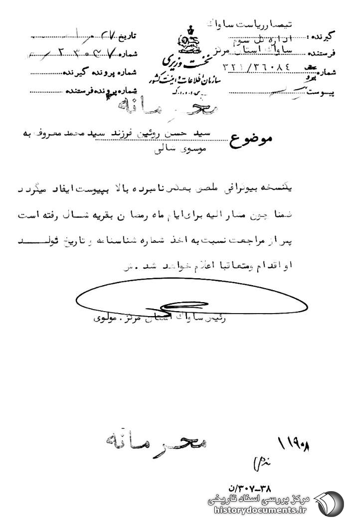 یک نسخه بیوگرافی ملصق به عکس نامبرده بالا به پیوست ایفاد میگردد ضمناً چون مشارالیه برای ایام ماه رمضان به قریه شال رفته است پس از مراجعت نسبت به اخذ شماره شناسنامه و تاریخ تولد او اقدام و متعاقباً اعلام خواهد شد. ش