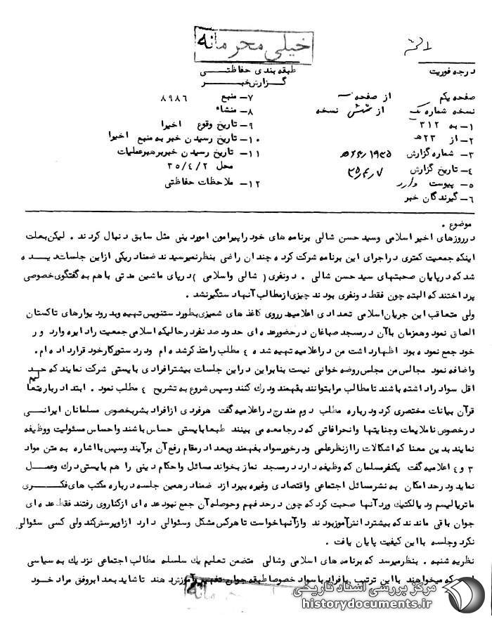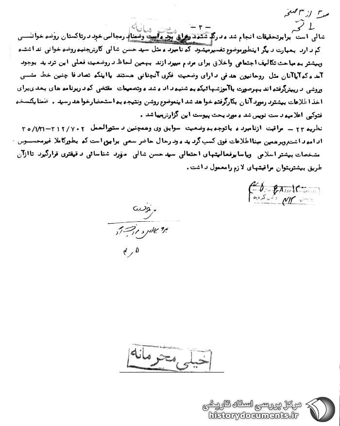 نظریه سهشنبه: گزارش و نظریه شنبه تایید میشود سیدحسن شالی و اسلامی مورد بحث که خواهرزاده سیدحسن شالی است برابر تحقیقات انجام شده در گذشته و در عراق بوده است و ضمناً در مجالس خود در تاکستان روضهخوانی کم دارد به عبارت دیگر این طور موضوع تفسیر میشود که نامبرده مثل سیدحسن شالی کارش جنبه روضهخوانی نداشته و بیشتر به مباحث تکالیف اجتماعی و اخلاق برای مردم میپردازند به همین لحاظ در وضعیت فعلی این تردید به وجود آمده که آیا آنان مثل روحانیون هدفی دارای وضعیت فکری آن چنانی هستند یا اینکه تصادفاً چنین خط مشی و روشی در پیش گرفتهاند به هر صورت با آموزشهایی که به شنبه داده شده و تصمیمات مقتضی که در برنامههای بعدی برای اخذ اطلاعات بیشتر در مورد آنان به کار گرفته خواهد شد این موضوع روشن و نتیجه به استحضار خواهد رسید ضمناً یک نسخه فتوکپی اعلامیه دستنویس شده مورد بحث پیوست این گزارش میباشد.3
