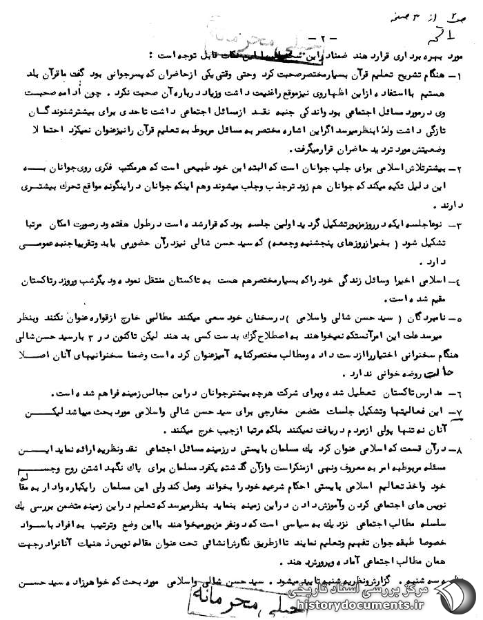 ۳ـ نوعاً جلسهای که در روز مزبور تشکیل گردید اولین جلسه بود که قرار شده است در طول هفته و در صورت امکان مرتباً تشکیل شود (به غیر از روزهای پنجشنبه و جمعه) که سیدحسن شالی نیز در آن حضور مییابد و تقریباً جنبه عمومــی دارد.