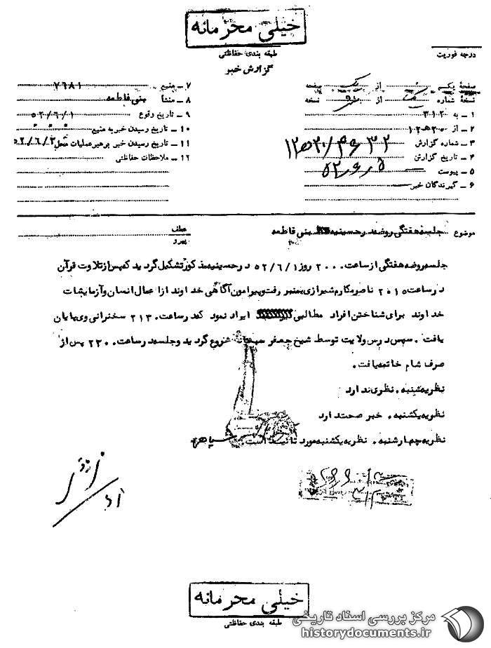 جلسه روضه هفتگی از ساعت 2000 روز 1 /6 /52 در حسینیه مذکور تشکیل گردید که پس از تلاوت قرآن در ساعت 2015 ناصر مکارم شیرازی به منبر رفت و پیرامون آگاهی خداوند از اعمال انسان و آزمایشات خداوند برای شناختن افراد مطالبی ایراد نمود که در ساعت 2130 سخنرانی وی پایان یافت. سپس درس ولایت توسط شیخ جعفر سبحانی شروع گردید و جلسه در ساعت 2300 پس از صرف شام خاتمه یافت.