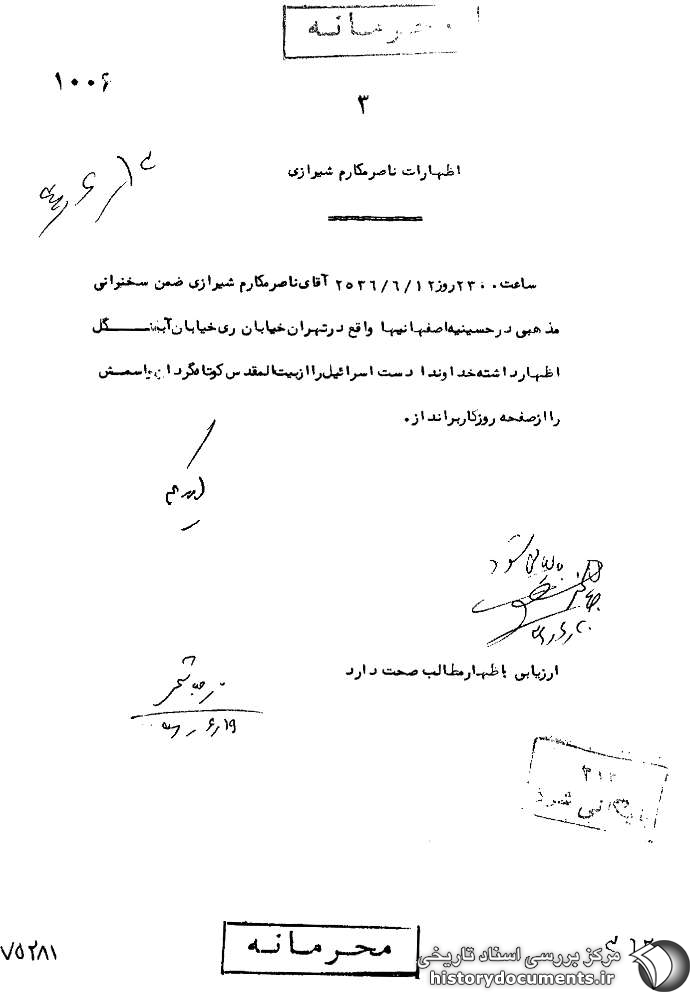 ساعت 2300 روز 12 /6 /2536 آقای ناصر مکارم شیرازی ضمن سخنرانی مذهبی در حسینیه اصفهانیها واقع در تهران خیابان ری خیابان آبمنگل اظهار داشته خداوندا دست اسرائیل را از بیتالمقدس کوتاه گردان و اسمش را از صفحه روزگار برانداز.