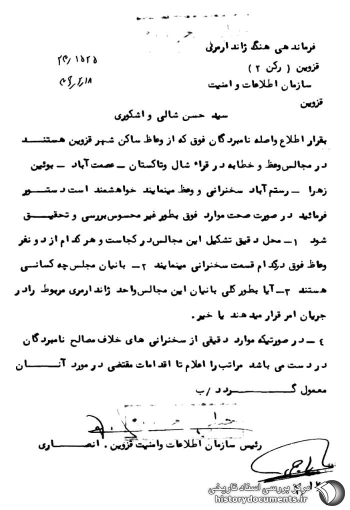 به قرار اطلاع واصله نامبردگان فوق که از وعاظ ساکن شهر قزوین هستند در مجالس وعظ و خطابه در قراء شال و تاکستان ـ عصمتآباد ـ بوئینزهرا ـ رستمآباد سخنرانی و وعظ مینمایند خواهشمند است دستور فرمایید در صورت صحت موارد فوق به طور غیر محسوس بررسی و تحقیق شود 1ـ محل دقیق تشکیل این مجالس در کجاست و هر کدام از دو نفر وعاظ فوق در کدام قسمت سخنرانی مینمایند2ـ بانیان مجلس چه کسانی هستند 3ـ آیا به طور کلی بانیان این مجالس واحد ژاندارمری مربوط را در جریان امر قرار میدهند یا خیر ۴ـ در صورتی که موارد دقیقی از سخنرانیهای خلاف مصالح نامبردگان در دست میباشد مراتب را اعلام تا اقدامات مقتضی در مورد آنان معمول گردد.