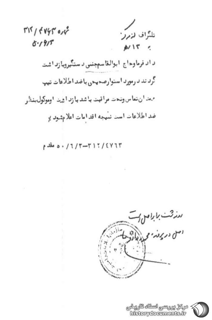 دادفرما و حاج ابوالقاسم جنتی دستگیر و بازداشت کردند در مورد استوار صحیحی با ضداطلاعات تیپ همدان تماس و تحت مراقبت باشد بازداشت او موکول به نظر ضداطلاعات است نتیجه اقدامات اعلام شود