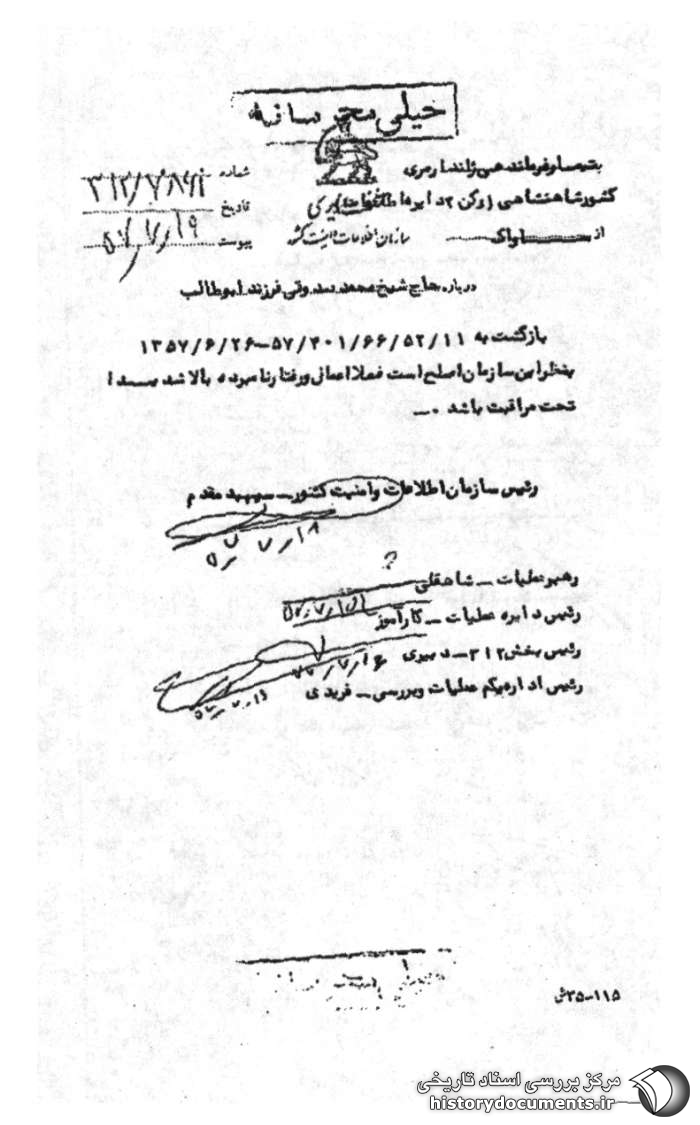 بازگشت به ۱۱/۵۲/۶۶/۴۰۱- ۲۶/۶/۱۳۵۷ به نظر این سازمان اصلح است فعلاً اعمال و رفتار نامبرده بالا شدیداً تحت مراقبت باشد.