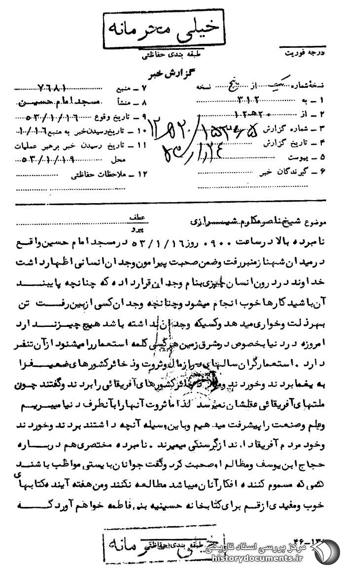 نامبرده بالا در ساعت 0900 روز 16 /1 /53 در مسجد امام حسین واقع در میدان شهناز منبر رفت و ضمن صحبت پیرامون وجدان انسانی اظهار داشت خداوند در درون انسان چیزی به نام وجدان قرار داد که چنانچه پایبند آن باشید کارها خوب انجام میشود و چنانچه وجدان کسی از بین رفت تن به هر ذلت و خواری میدهد و کسی که وجدان نداشته باشد هیچ چیز ندارد. امروزه در دنیا بخصوص در مشرق زمین هر کسی که کلمه استعمار را میشنود از آن تنفر دارد. استعمارگران سالهای دراز، مال و ثروت و ذخایر کشورهای ضعیف را به یغما بردند و خوردند و[ناخوانا] ذخایر کشورهای آفریقایی را بردند و گفتند چون ملتهای آفریقایی عقلشان نمیرسد لذا ما ثروت آنها را به آن طرف دنیا میبریم و علم و صنعت را پیشرفت میدهیم و به این وسیله آنچه داشتند بردند و خوردند و خود مردم آفریقا دارند از گرسنگی میمیرند. نامبرده مختصری هم درباره حجاج ابنیوسف و مظالم او صحبت کرد و گفت جوانان بایستی مواظب باشند کتبی که مسمومکننده افکار آنان میباشد مطالعه نکنند و من هفته آینده کتابهای خوب و مفیدی از قم برای کتابخانه حسینیه بنیفاطمه خواهم آورد که میتوانید بعدازظهرها به کتابخانه حسینیه بنیفاطمه مراجعه و آنها را مطالعه کنید. این مجلس در ساعت 1010 پایان یافت.