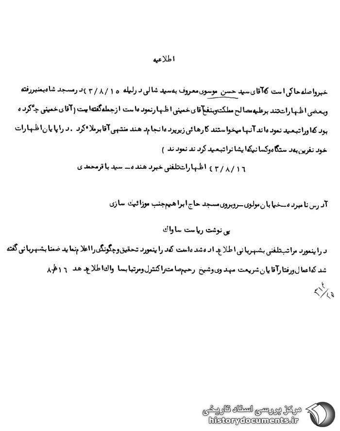 خبر واصله حاکی است که آقای سیدحسن موسوی معروف به سید شالی در لیله 15 / 8 / 43 در مسجد شاه به منبر رفته و بعضی اظهارات تند بر علیه مصالح و به نفع آقای خمینی اظهار نموده است از جمله گفت است (آقای خمینی چه کرده بود که او را تبعید نمودهاند1 آنها میخواستند کارهایی زیر پرده انجام دهند منتهی آقا برملاء کرد. در پایان اظهارات خود نفرین به دستگاه و کسانی که ایشان را تبعید کردند نمودند.)