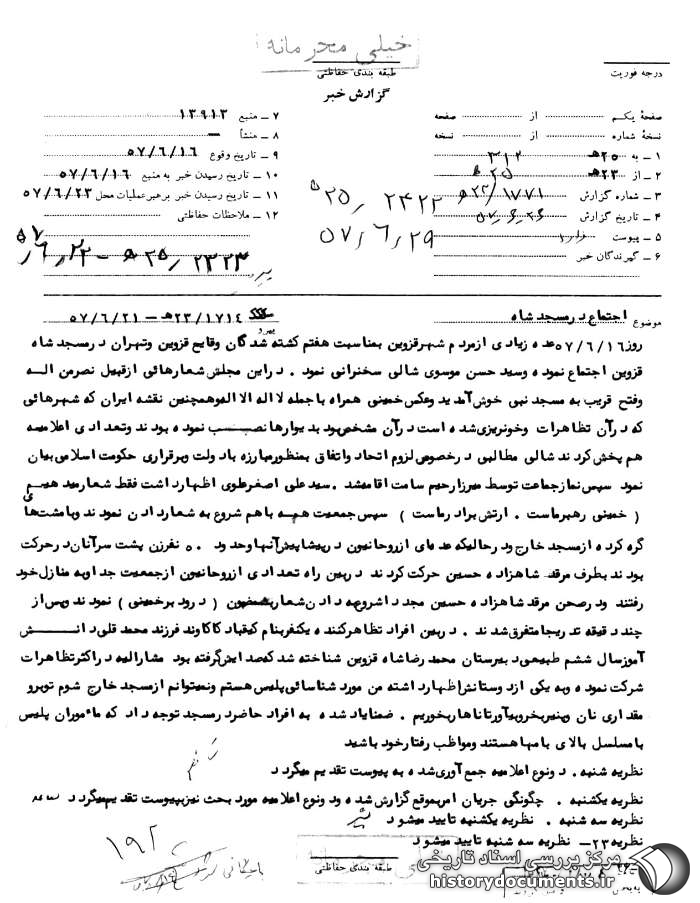 روز ۱۶ / ۶ / ۵۷ عده زیادی از مردم شهر قزوین به مناسبت هفتم کشتهشدگان وقایع قزوین و تهران در مسجد شاه قزوین اجتماع نموده و سیدحسن موسوی شالی سخنرانی نمود در این مجلس شعارهایی از قبیل نصرمنالله و فتح قریب به مسجد نبی خوش آمدید و عکس خمینی همراه با جمله لا اله الا الله و همچنین نقشه ایران که شهرهایی که در آن تظاهرات و خونریزی شده است در آن مشخص بود به دیوارها نصب نموده بودند و تعدادی اعلامیه هم پخش کردند1 شالی مطالبی در خصوص لزوم اتحاد و اتفاق به منظور مبارزه با دولت و برقراری حکومت اسلامی بیان نمود سپس نماز جماعت توسط میرزارحیم سامت اقامه شد سیدعلی اصغر علوی اظهار داشت فقط شعار میدهیم (خمینی رهبر ماست ارتش برادر ماست) سپس جمعیت همه با هم شروع به شعار دادن نمودند و با مشتهای گره کرده از مسجد خارج و در حالی که عدهای از روحانیون در پیشاپیش آنها و حدود ۵۰ نفر زن در پشت سر آنان در حرکت بودند به طرف مرقد شاهزاده حسین حرکت کردند و در بین راه تعدادی از روحانیون از جمعیت جدا و به منازل خود رفتند و در صحن مرقد شاهزاده حسین مجدداً شروع به دادن شعار به مضمون (درود بر خمینی) نمودند و پس از چند دقیقه تدریجاً متفرق شدند در بین افراد تظاهرکننده یک نفر به نام کیقباد کاکاوند فرزند محمد قلی دانشآموز سال ششم طبیعی دبیرستان محمدرضا شاه قزوین شناخته شد که صدایش گرفته بود مشارالیه در اکثر تظاهرات شرکت نموده و به یکی از دوستانش اظهار داشته من مورد شناسایی پلیس هستم و نمیتوانم از مسجد خارج شوم تو برو مقداری نان و پنیر بخر بیاور تا ناهار بخوریم ضمناً یادشده به افراد حاضر در مسجد توجه داد که ماموران پلیس با مسلسل بالای بامها هستند و مواظب رفتار خود باشید.
