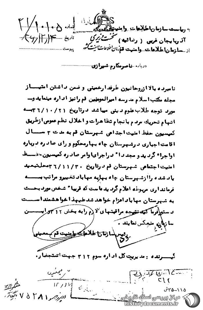 نامبرده بالا [که] از روحانیون طرفدار خمینی [است] و ضمن داشتن امتیاز مجله مکتب اسلام، مدرسه امیرالمومنین قم را نیز اداره مینماید و مورد توجه طلاب علوم دینی میباشد در تاریخ 21 /10 /36 به اتهام تحریک مردم به انجام تظاهرات و اخلال نظم عمومی از طریق کمیسیون حفظ امنیت اجتماعی شهرستان قم به مدت 3 سال اقامت اجباری در شهرستان چاهبهار محکوم و رأی صادره درباره او اجراء گردید و مجدداً در اجرای اوامر صادره کمیسیون حفظ امنیت اجتماعی شهرستان در در تاریخ 30 /11 /36 محل تبعید یادشده را از شهرستان چاهبهار به مهاباد تغییر [داده] و مراتب به فرمانداری مربوطه اعلام گردیده است که قریباً شخص مورد بحث به شهرستان مهاباد اعزام خواهد شد. علیهذا خواهشمند است دستور فرمایید نتیجه مراقبتهای لازم را به بخش 312 و این سازمان منعکس نمایند.1
