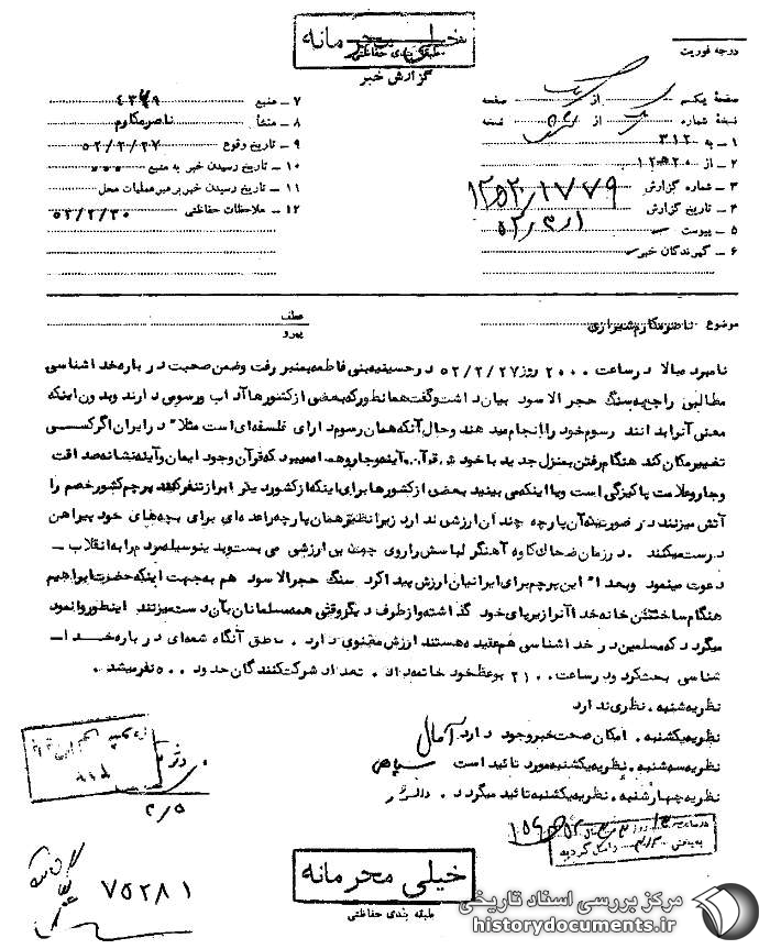 نامبرده بالا در ساعت 2000 روز 27 /2 /52 در حسینیه بنیفاطمه به منبر رفت و ضمن صحبت درباره خداشناسی مطالبی راجع به سنگ حجرالأسود بیان داشت و گفت همانطور که بعضی از کشورها آداب و رسومی دارند و بدون اینکه معنی آن را بدانند رسوم خود را انجام میدهند و حال آنکه همان رسوم دارای فلسفهای است مثلاً در ایران اگر کسی تغییر مکان کند هنگام رفتن به منزل جدید با خودش قرآن و آینه و جارو همراه میبرد که قرآن وجود ایمان و آینه نشانه صداقت و جارو علامت پاکیزگی است و یا اینکه میبینید بعضی از کشورها برای اینکه از کشور دیگر ابراز تنفر کنند پرچم کشور خصم را آتش میزنند در صورتی که آن پارچه چندان ارزشی ندارد زیرا نظیر همان پارچه را عدهای برای بچههای خود پیراهن درست میکنند. در زمان ضحاک، کاوه آهنگر لباسش را روی چوب بیارزشی میبست و بدینوسیله مردم را به انقلاب دعوت مینمود و بعداً این پرچم برای ایرانیان ارزش پیدا کرد. سنگ حجرالأسود هم به جهت اینکه حضرت ابراهیم هنگام ساختن خانه خدا آن را زیر پای خود گذاشته1 و [از] طرف دیگر وقتی همه مسلمانان به آن دست میزنند این طور وانمود میگردد که مسلمین در خداشناسی همعقیده هستند ارزش معنوی دارد. ناطق آنگاه شمهای درباره خداشناسی بحث کرد و در ساعت 2100 به وعظ خود خاتمه داد. تعداد شرکتکنندگان حدود 500 نفر میشد.