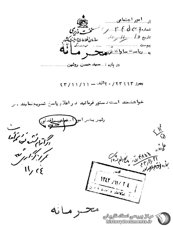 به: ریاست ساواک قزوین شماره: 24539 / 20الف