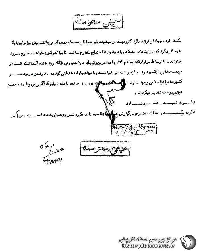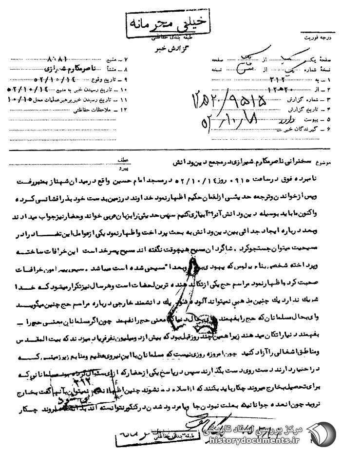 نامبرده فوق در ساعت 0915 روز 14 /10 /52 در مسجد امام حسین واقع در میدان شهناز به منبر رفت و پس از خواندن و ترجمه حدیثی از لقمان حکیم اظهار نمود. خداوند در زمین به دست خود بذرافشانی کرده و اکنون ما باید به وسیله دین و دانش آن را آبیاری کنیم. سپس حدیثی را به زبان عربی خواند و حضار نیز جواب میدادند و بعد درباره ایجاد جدایی بین دین و دانش به بحث پرداخت و اظهار نمود یکی از عوامل این تضاد را در مسیحیت میتوان جستجو کرد. شاگردان مسیح هیچ وقت نگفتهاند مسیح پسر خداست، این خرافات ساخته و پرداخته شخصی به نام پولوس1 که یهودی بوده و بعداً مسیحی شده است میباشد. سپس پیرامون خرافات صحبت کرد و اظهار نمود مراسم حج یکی از تکاندهندهترین لحظات است و هر سال نیز تکرار میشود که خدا شریک ندارد یک چنین مذهبی نمیتواند آلوده شود. یک دانشمند خارجی درباره مراسم حج چنین میگوید وای به حال مسلمانان که حج را بفهمند و وای به حال دنیا که معنی حج را نفهمد. چون اگر مسلمانان معنی حج را بفهمند دنیا را تکان میدهند زیرا همین چند روز قبل بود که بیش از دو میلیون نفر فریاد میزدند که بیتالمقدس و مناطق اشغالی را آزاد کنید. چون امروزه روزی نیست که مسلمانان با این نیروی عظیم و منابع زیرزمینی که در اختیار دارند دست روی دست بگذارند. سپس در پاسخ یکی از حضار که از وی سؤال کرده بود مسلمانانی که برای تحصیل به خارج میروند چه کار باید بکنند که از اسلام دور نشوند، چنین اظهار نمود. نمیتوان به آنها گفت به خارج نروید چون آن عده جوانانی که به علت نبودن جا و یا مردود شدن در کنکور نتوانستهاند به دانشگاه بروند چه کار بکنند. فردا جوانان فِرَق دیگر دکتر و مهندس میشوند ولی جوانان مسلمان بیسواد میمانند پس بنابراین اولاً باید کاری کرد که در اینجا دانشگاه زیاد بشود تا احتیاج به خارج نباشد. ثانیاً هر کس بخواهد به خارج برود میتواند با ما ارتباط برقرار کند و ما هم کتابهای شیرین و کوچک در اختیارش میگذاریم مانند آنهایی که قبل از عزیمت به خارج از کشور در قم از ما راهنمایی خواستند و ما نیز آنها را راهنمایی کردیم. در ضمن در بیشتر کشورها مراکز اسلامی وجود دارد. این جلسه در ساعت 1015 خاتمه یافت. یک برگ آگهی مربوط به مجمع فوق به پیوست2 تقدیم میگردد.