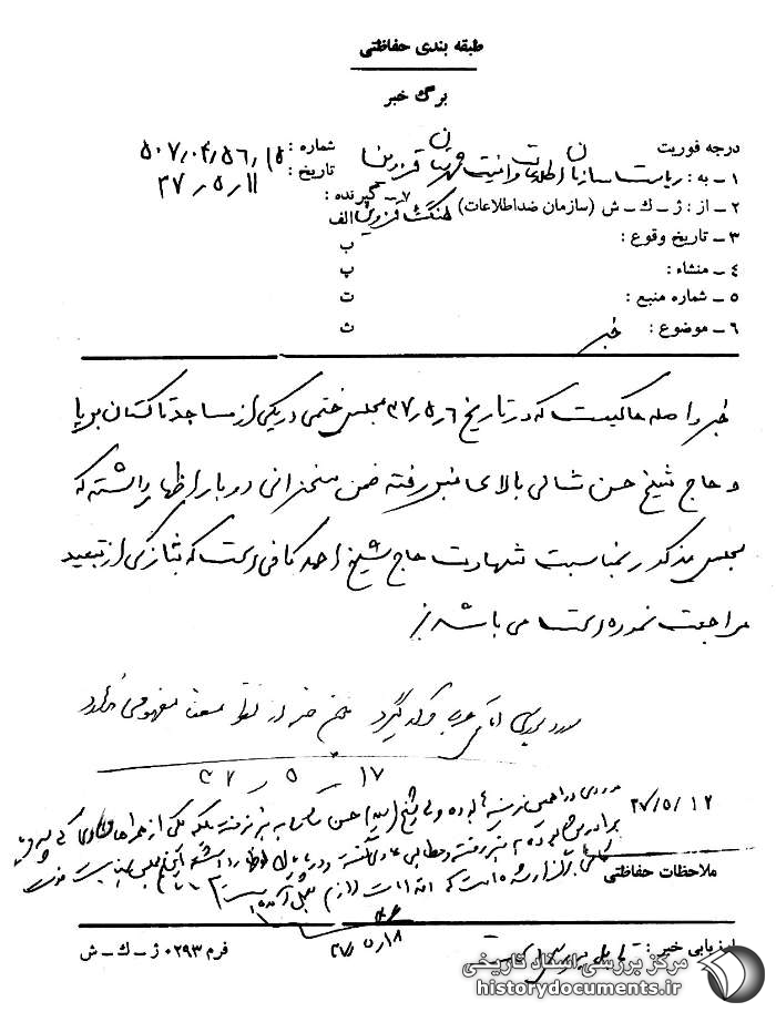 خبر واصله حاکیست که در تاریخ 6 / 5 / 37 مجلس ختمی در یکی از مساجد تاکستان برپا و حاج شیخ حسن شالی بالای منبر رفته ضمن سخنرانی دو بار اظهار داشته که مجلس مذکور به مناسبت شهادت حاج شیخ احمد کافی است که به تازگی از تبعید مراجعت نموده است میباشد.