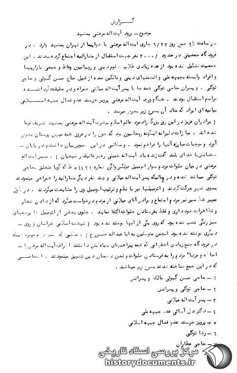 در ساعت 9:30 صبح روز 27 /6 جاری آیتالله مرعشی با هواپیما از تهران به مشهد وارد، در فرودگاه جمعیتی در حدود 3000 نفر جهت استقبال از مشارالیه اجتماع کرده بودند. این جمعیت تشکیل شده بود از عده زیادی طلاب علوم دینی و روحانیون وعاظ و جمعی بازاریها و افراد وابسته به جبهه ملی و انجمنهای دینی و مالکین عمده از قبیل حاج حسن گلبویی و حاجی توکلی؛ و پسران حاجی توکلی همهجا با پسر آیتالله میلانی همراه و در حقیقت گرداننده مراسم استقبال بودند. هنگام ورود آیتالله مرعشی، پرویز خرسند عضو فعال جبهه اسلامی، بیانیهای ایراد که مفاد آن به شرح زیر به عرض میرسد.
