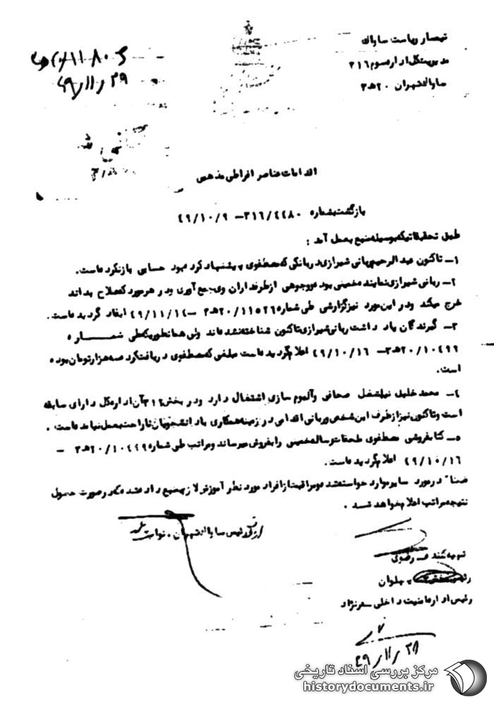 اقدامات عناصر افراطی مذهبی بازگشت بشماره 4480/316 ـ 9/10/49
