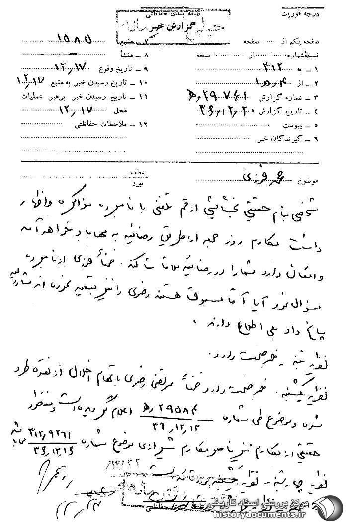 نظریه یکشنبه. خبر صحت دارد ضمناً مرتضی رضوی3 به اتهام اخلال از نقده طرد شده و موضوع طی شماره 29584/ ﻫ - 13 /12 /36 اعلام گردیده است و منظور عقیقی4 از مکارم نیز ناصر مکارم شیرازی موضوع شماره 9261 /312 - 16 /12 /36 میباشد.