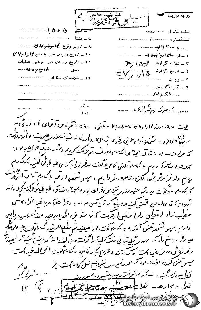 ساعت 0900 روز 14 /1 /37 نامبرده بالا با تلفن 2360 قم تماس و آقای طباطبایی که میهمان وی بود با شخصی به نام حسین رضوی شاغل در داروخانه شبانهروزی صحبت و اظهار داشت که من از مهاباد به اتفاق بچههای مکارم به طرف قم حرکت کردیم و شب در قم خواهیم بود. سپس حاج عباس آزرم با مکارم تلفنی تماس و گفت موضوع را به آقای طباطبایی گفتید؛ که مکارم پاسخ داد فراموش شده لکن باز هم مسافر داریم. سپس شخصی از قم با مکارم تماس تلفنی گرفت که مکارم به او گفت پدر شما چند روزی نزد من خواهد بود و بچهها به اتفاق طباطبایی حرکت کردهاند شما از آقای امامی1 تحقیق کنید و ببینید که آیا کسی به مهاباد خواهد آمد یا خیر. افرادی مثل خطیبزاده (قطیل زاد) و قبل از حرکت آنها حتماً به من اطلاع بدهید چون کار بسیار واجبی دارم. سپس شخص تلفنکننده به مکارم گفت از فیضیه قم مطلع هستید. مکارم گفت بله ولی بعدش چه شد. پاسخ داد که مهدی گلپایگانی رفته کلیدها را گرفته و به او گفتهاند که بایستی شیشهها را بیندازند و خونهایی [که] روی زمین است پاک کنند و شروع به کار نمایند و مکارم گفت الحمدالله خیر است. سپس تلفنکننده اضافه نمود که همسر تیموری نیز وضع حمل کرده است.