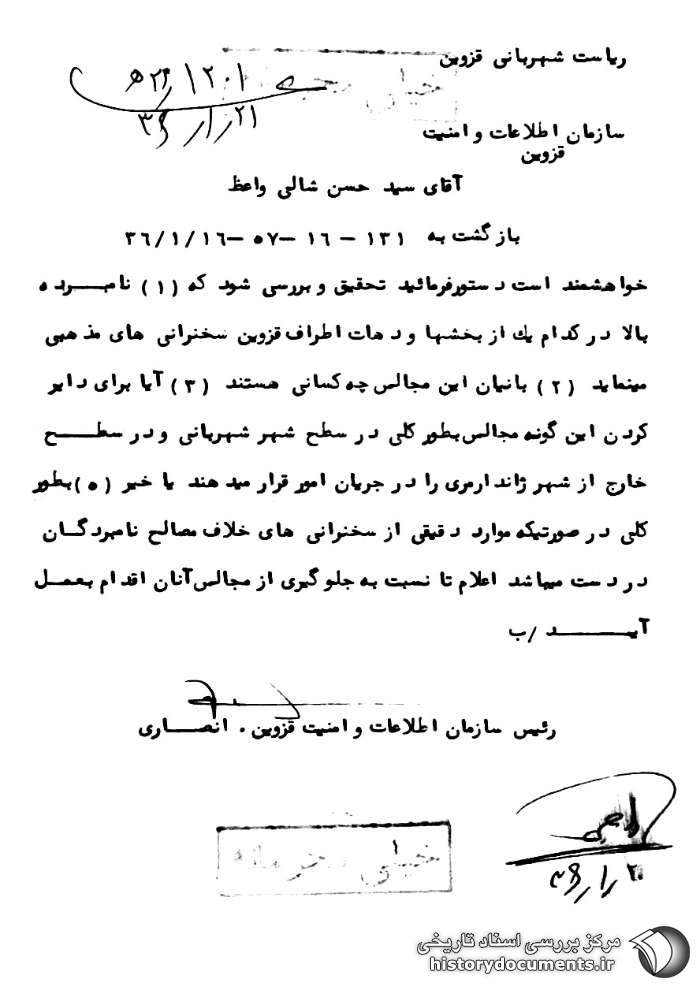 خواهشمند است دستور فرمایید تحقیق و بررسی شود که (1) نامبرده بالا در کدام یک از بخشها و دهات اطراف قزوین سخنرانیهای مذهبی مینماید (2) بانیان این مجالس چه کسانی هستند(3) آیا برای دایر کردن این گونه مجالس به طور کلی در سطح شهر شهربانی و در سطح خارج از شهر ژاندارمری را در جریان امور قرار میدهند یا خیر (5) به طور کلی در صورتی که موارد دقیقی از سخنرانیهای خلاف مصالح نامبردگان در دست میباشد اعلام تا نسبت به جلوگیری از مجالس آنان اقدام به عمل آید.