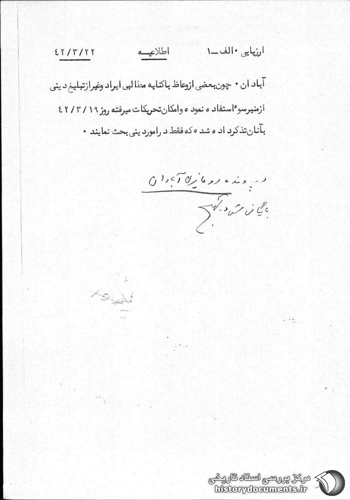 آبادان - چون بعضی از وعاظ با کنایه مطالبی ایراد و غیر از تبلیغ دینی از منبر سوء استفاده نموده و امکان تحریکات میرفته روز 19 /3 /42 به آنان تذکر داده شده که فقط در امور دینی بحث نمایند.