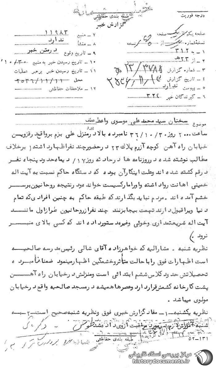ساعت 2000 روز 30 / 10 / 36 نامبرده بالا در منزل علی بزم بر واقع در قزوین خیابان راهآهن کوچه آزرم پلاک 23 در حضور چند نفر اظهارداشته (برخلاف مطالب نوشته شده در روزنامهها در حادثه روز 17 / دی1 ماه حدود پنجاه نفر در قم کشته شدهاند و علت این کار آن بوده که دستگاه حاکم نسبت به آیتاله خمینی اهانت روا داشته و او را مارکسیست خوانده و درنتیجه روحانیون بر سر خشم آمدهاند. مردم نباید بگذارند که طبقه حاکم به چنین افرادی که تمام دنیا وی را قبول دارند تهمت بیجا بزنند چند نفر از روحانیون طراز اول مانند آیتاله شریعتمداری و خوئی و غیره دستور دادهاند که کسی بالای منبر نرود.)