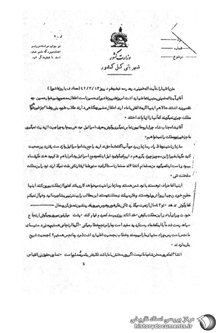 انشاء اله که روى سخن شاه با ما نیست اگر روى سخنش با ما باشد تکلیفش یکسره و معلوم است. تساوى حقوق زن اقتباس از عبدالبهاء است که در تقویم سه سال قبل نوشته است مگر تو بهائى هستى تو که میگوئى من مسلمان هستم. من دیگر سرم درد گرفت و ناراحت شدم و دیگر نمیتوانم حرف بزنم و الا حرف زیاد دارم. روزى که بمدرسه فیضیه حمله شد با سوت یکنفر مرد شروع شد که اسم او را میدانم ولى فعلاً نمیگویم.