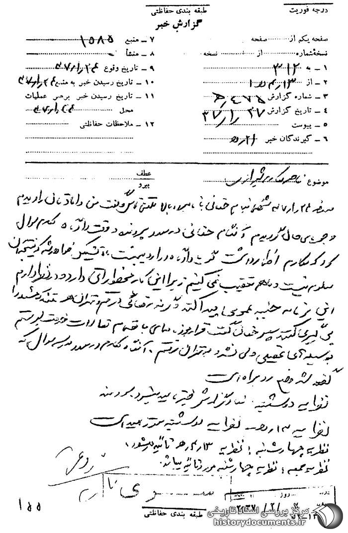 مورخه 24 /1 /37 شخصی به نام حقانی1 با نامبرده بالا تلفنی تماس و گفت من دامادتان را دیدم و جویای حال گردیدم آنگاه حقانی در مورد پرونده و وقت دادگاه مکارم سئوال کرد که مکارم اظهار داشت گویا دادگاه در اردیبهشت ماه تشکیل خواهد شد که نتیجه آن معلوم نیست و ما هم تعقیب نمیکنیم زیرا این کار محظوراتی دارد و در نظر دارم این برنامه جنبه عمومی پیدا کند وگرنه رفقایی در قم و تهران هستند که مسئله را پیگیری کنند. سپس حقانی گفت قرار بود نامهای به انضمام مقالات خدمت بفرستم به وسیله آقای عقیلی ولی نشد و به تهران رفتم. آنگاه مکارم در مورد مدرسه سؤال [کرد] که گفته شد وضع روبراه است.
