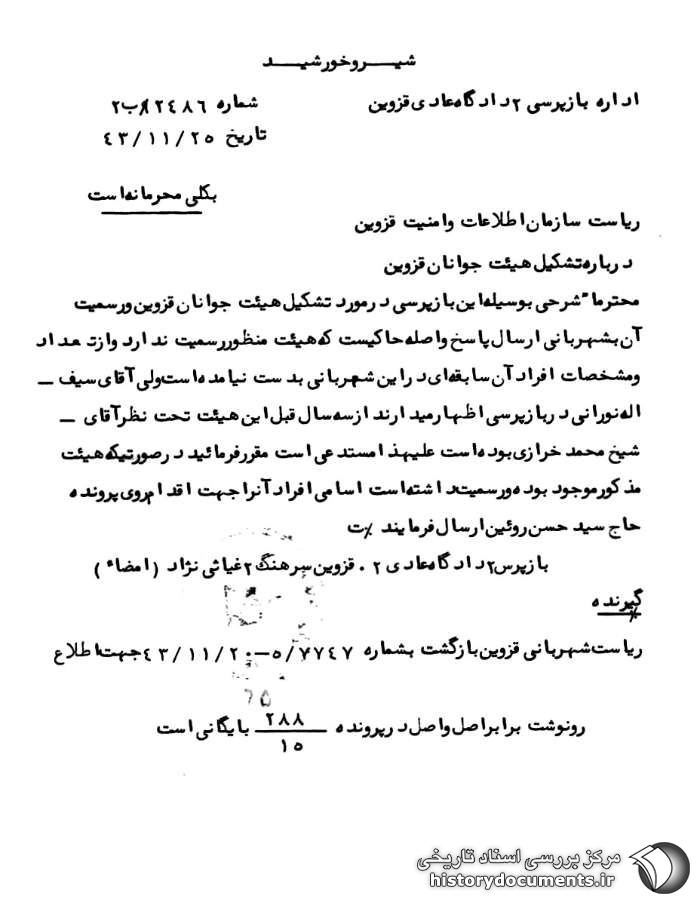 محترماً شرحی به وسیله این بازپرسی در مورد تشکیل هیئت جوانان قزوین و رسمیت آن به شهربانی ارسال پاسخ واصله حاکیست که هیئت منظور رسمیت ندارد و از تعداد و مشخصات افراد آن سابقهای در این شهربانی به دست نیامده است ولی آقای سیفاله نورانی در بازپرسی اظهار میدارند از سه سال قبل این هیئت تحت نظر آقای شیخ محمد خرازی بوده است علیهذا مستدعی است مقرر فرمایید در صورتی که هیئت مذکور موجود بوده و رسمیت داشته است اسامی افراد آن را جهت اقدام روی پرونده حاج سیدحسن روئین ارسال فرمایند / ت