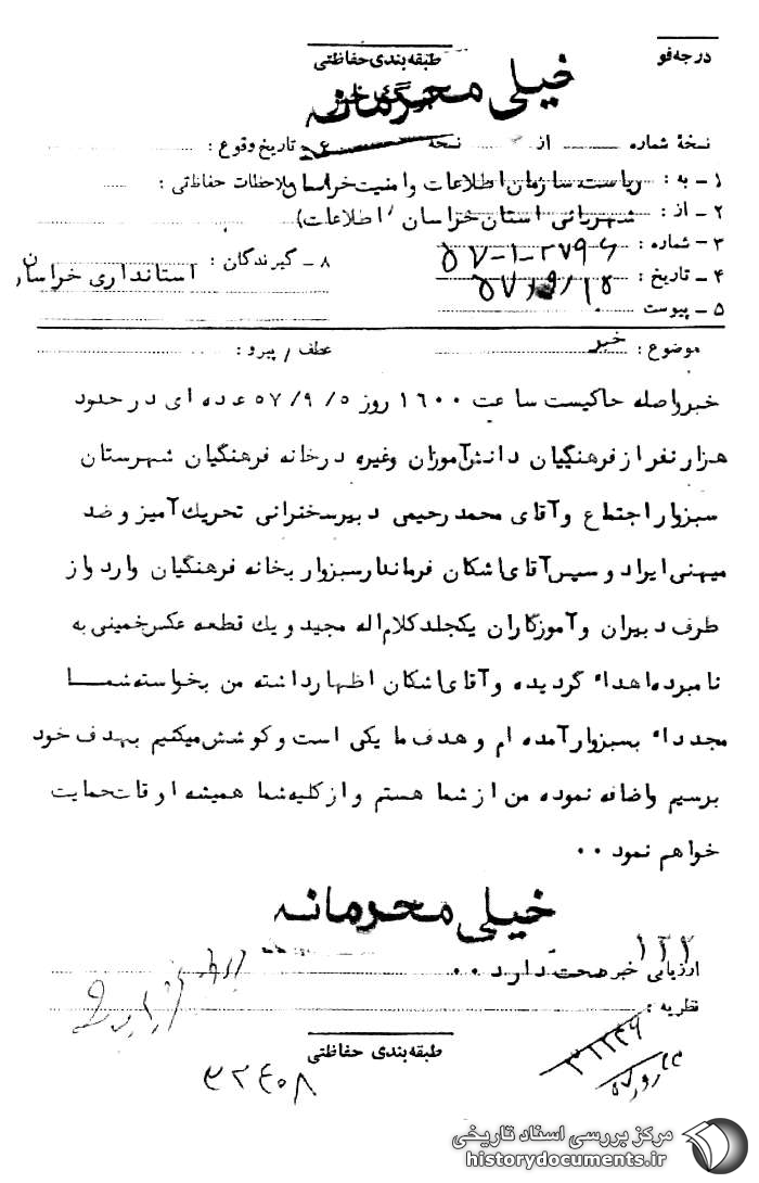 ساعت 1600 روز 5 /9 /57 عدهای در حدود هزار نفر از فرهنگیان، دانشآموزان و غیره در خانه فرهنگیان شهرستان سبزوار اجتماع و آقای محمد رحیمی دبیر سخنرانی تحریکآمیز و ضد میهنی ایراد و سپس آقای اشکان فرماندار سبزوار به خانه فرهنگیان وارد و از طرف دبیران و آموزگاران یک جلد کلامالله مجید و یک قطعه عکس خمینی به نامبرده اهداء گردیده و آقای اشکان1 اظهار داشته من به خواسته شما مجدداً به سبزوار آمدهام و هدف ما یکی است و کوشش میکنیم به هدف خود برسیم و اضافه نموده من از شما هستم و از کلیه شما همیشه اوقات حمایت خواهم نمود.