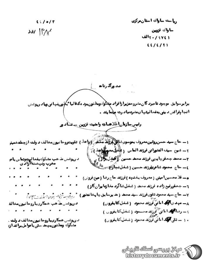 برابر سوابق موجود نامبردگان مشروحه زیر از افراد مشکوک و مظنون بوده که غالباً به طور پنهانی و یا در پوشش انجام فرائض دینی به فعالیتهای مضره مبادرت مینمایند.